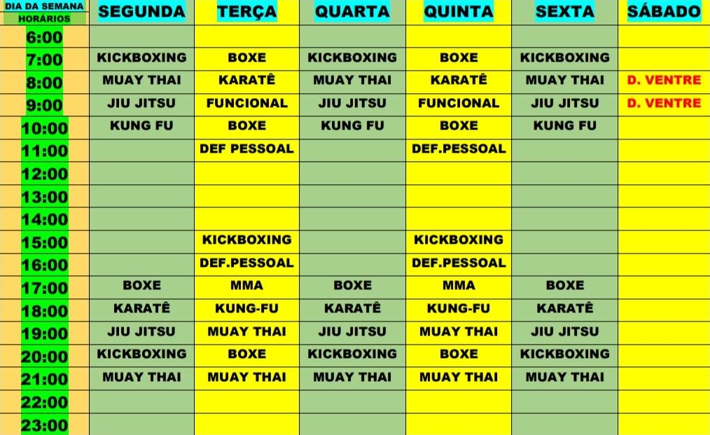 Explore nossa grade horária diversificada, com modalidades de luta para todos os gostos: Muay Thai, Boxe, Jiu-Jitsu, MMA, Kickboxing e mais! Oferecemos horários flexíveis pela manhã, tarde e noite, para que você possa treinar no momento que melhor se encaixa na sua rotina. Escolha sua modalidade e venha para o treino!